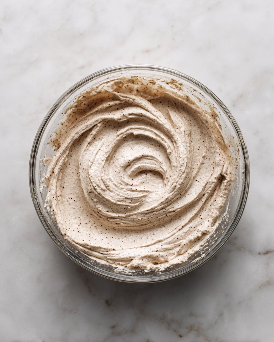 - Gradually add powdered sugar and cinnamon. Adding the sugar slowly helps prevent clouds of dust and keeps the frosting perfectly smooth. Mix on low speed at first, then increase to medium once incorporated. You’ll smell that warm cinnamon start to dance in the bowl—a lovely signal that you’re on the right track.
