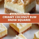 Can I make these squares without alcohol? Absolutely—simply omit the rum or substitute with coconut extract for a similar tropical aroma without spirits. The filling’s texture and flavor remain delightful. Why does the cornstarch matter here? Cornstarch is the key thickener that gives the filling its silky yet firm texture without heaviness. It helps these snow squares hold their shape beautifully when sliced. Can I use fresh coconut instead of shredded? Fresh coconut can work but won’t dissolve the same way, leaving more texture in the filling. If you enjoy a bit of chew, fresh is great—otherwise shredded coconut blends more smoothly. How do I ensure a crisp crust and smooth filling? Keep your crust chilled before adding the filling, and whisk the filling constantly over medium heat to avoid lumps or burning. Patience here makes all the difference. Can I double the recipe? Yes! Use a 9×13 pan and extend chilling time accordingly. Just keep an eye on spreading the filling evenly so the squares have consistent thickness. PrintCoconut Rum Snow Squares Recipe