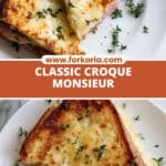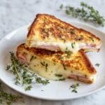 A classic French Croque Monsieur sandwich featuring layers of ham and melted Gruyere cheese, topped with a rich béchamel sauce and baked to golden perfection. This comforting grilled ham and cheese sandwich is perfect for brunch or a cozy lunch.