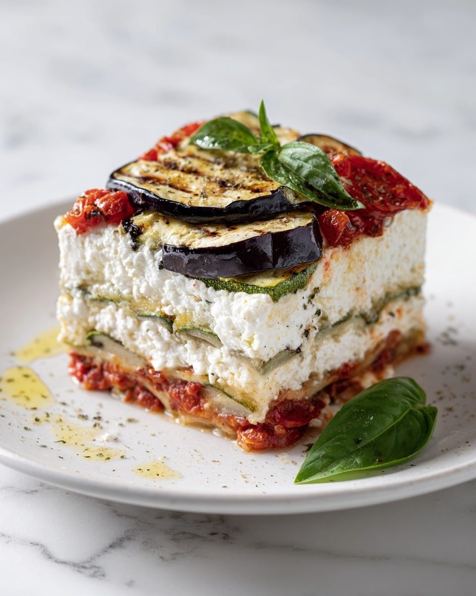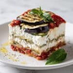 This Layered Mediterranean Vegetable Lasagna features roasted eggplant, zucchini, and bell peppers layered with creamy ricotta, mozzarella, parmesan cheese, and fragrant herbs, baked to perfection in a rich marinara sauce. It’s a flavorful vegetarian twist on classic lasagna, perfect for a hearty yet healthy meal.