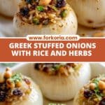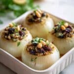 Greek Stuffed Onions are a savory, aromatic dish featuring large sweet onions hollowed out and filled with a fragrant mixture of long-grain rice, pine nuts, currants, fresh herbs, and warming spices. Slowly cooked in vegetable broth with lemon juice and zest, these stuffed onions blend sweet, tangy, and earthy flavors for a delicious vegetarian main or side dish inspired by traditional Greek cuisine.