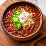 - Final touches and serve: Taste and adjust seasoning if needed. Ladle the chili into bowls and top with your favorites like shredded cheese, sour cream, and fresh jalapeños. The creamy and spicy toppings balance the smoky, meaty chili beautifully.