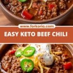 Is this Keto Beef Chili Recipe spicy? You control the heat! The recipe uses mild chili powder by default, but you can easily add more spice with jalapeños, cayenne, or chipotle peppers to suit your taste. Can I use other ground meats? Absolutely! Ground turkey or chicken work well, though beef has a richer flavor that I love in chili. You may need to adjust cooking times slightly for leaner meats. How do I prevent the chili from getting watery? Make sure to simmer uncovered and give it time to thicken. If it’s still too thin, raise the heat for a few minutes while stirring to reduce liquid. Can I make this in a slow cooker? Yes, brown the beef and sauté the aromatics first, then combine all ingredients in the slow cooker. Cook on low for 4–6 hours for best flavor. What are the best toppings for Keto Beef Chili Recipe? I love shredded sharp cheddar, cool sour cream, and spicy sliced jalapeños. Fresh herbs like cilantro add amazing brightness too! PrintKeto Beef Chili Recipe