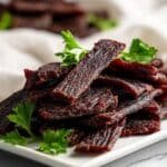 This Keto Beef Jerky recipe offers a flavorful and low-carb snack option perfect for anyone following a ketogenic diet. Made with thinly sliced flank steak and a savory marinade of soy sauce, Worcestershire, and spices, the beef jerky is oven-dried to achieve the perfect chewy texture without added sugars or carbs.
