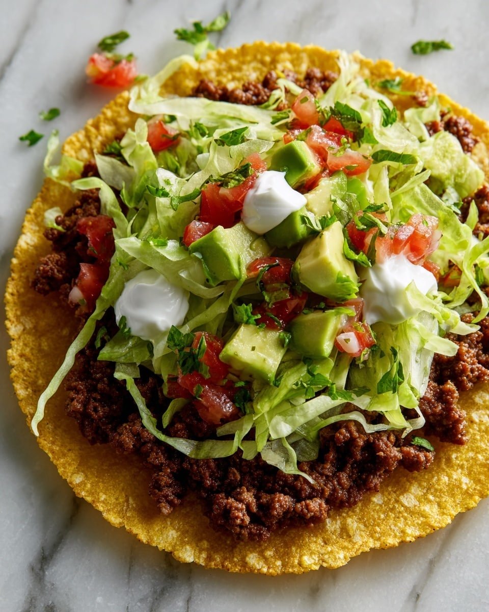 - Assemble the tostadas: Once the tortillas are crisp and the beef mixture is ready, build your tostadas. Start by layering the crispy tortillas with a generous spoonful of the seasoned ground beef, then add shredded lettuce, diced tomatoes, and shredded cheese. Finish with dollops of sour cream and sliced or diced avocado on top for creaminess and extra flavor.