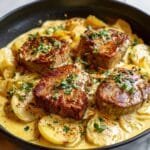 This Smothered Pork Chop and Scalloped Potato Casserole features tender bone-in pork chops nestled atop layers of thinly sliced potatoes baked in a creamy onion and garlic sauce, topped with melted cheddar cheese and a sprinkle of paprika. It’s a comforting one-dish meal perfect for family dinners, combining richly flavored pork with cheesy scalloped potatoes baked to golden perfection.